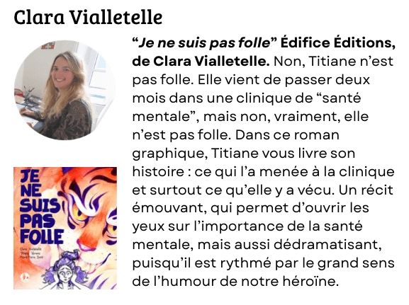 Sophie Adriansen, pour les BD : « Chère maman » (Ed. Glénat), « Figurante » (Ed. Robert Laffont), « Outre mères » (Ed. Vuibert), « La Remplaçante » (Ed. First) …